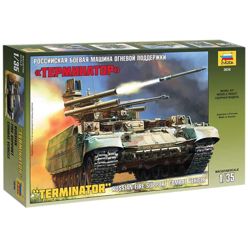 Боевая машина поддержки танков (БМПТ) получила неофициальное название «Терминатор» неслучайно. Боевая эффективность одной БМПТ превосходит два мотострелковых взвода, а это шесть БМП и около 40 человек личного состава. В отличие от танка она способна вести шквальный огонь по любым целям, как бы высоко они и не находились, и атаковать до четырёх целей одновременно.Модель для сборки Звезда "Российская боевая машина огневой поддержки "Терминатор", масштаб 1:35