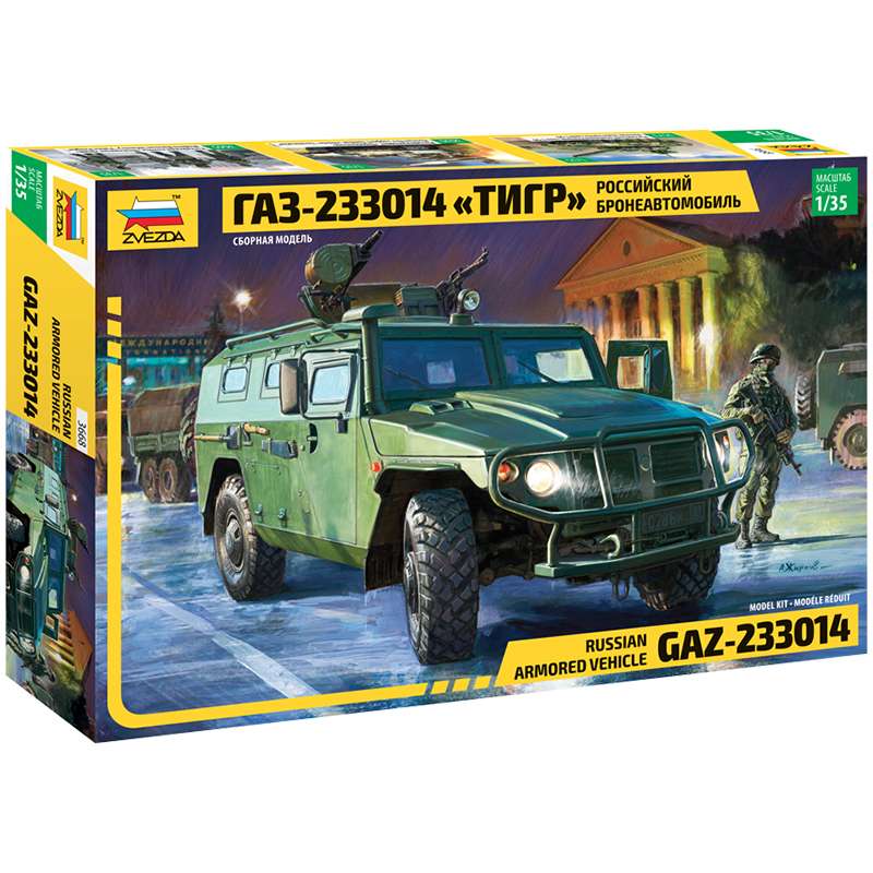 Российский бронеавтомобиль ГАЗ «Тигр» СТС (специальное транспортное средство) – современный многоцелевой автомобиль высокой проходимости. В последние годы обязательный участник парадов на Красной площади. «Тигр» неоднократно был замечен в различных спецоперациях, на базе автомобиля существует множество модификаций с противотанковым и стрелковым вооружением. Бронеавтомобиль заслужил высокую оценку в войсках и стал настоящей «визитной карточкой» современной, обновлённой Российской армии.Модель для сборки Звезда "Российский бронеавтомобиль ГАЗ "ТИГР", масштаб 1:35