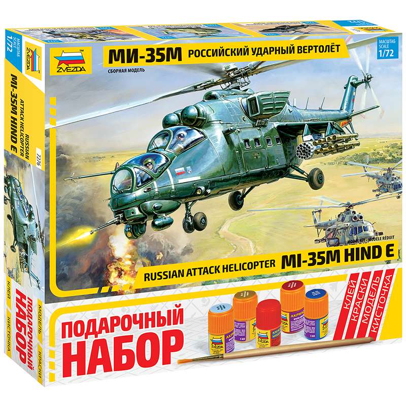 Ми-35М – многоцелевой ударный вертолет, «летающая боевая машина пехоты», разработанный в КБ Миля. Транспортно-боевые вертолеты этого типа предназначены для уничтожения бронетанковой техники противника ракетами и бомбами, огневой поддержки подразделений сухопутных войск, высадки десанта. Каждая машина перевозит 8 десантников с личным оружием. Вертолет Ми-35М –дальнейшая модернизация широко известного боевого вертолета Ми-24В, Ми-24 ВП. Отличается использованием новых несущего и рулевого винтов, модернизированным крылом и комплексом прицельно-навигационного оборудования, позволяющим применять вертолет круглосуточно, в простых и сложных метеоусловиях. Идеальная геометрия корпуса – в мире нет аналогов. Детально проработанный интерьер и двигатели. Фигурки пилотов в наборе. Состав набора: отливки модели, краски, клей, кисть, инструкция, подставка под краски.Набор для сборки модели Звезда "Российский ударный вертолет Ми-35М", масштаб 1:72