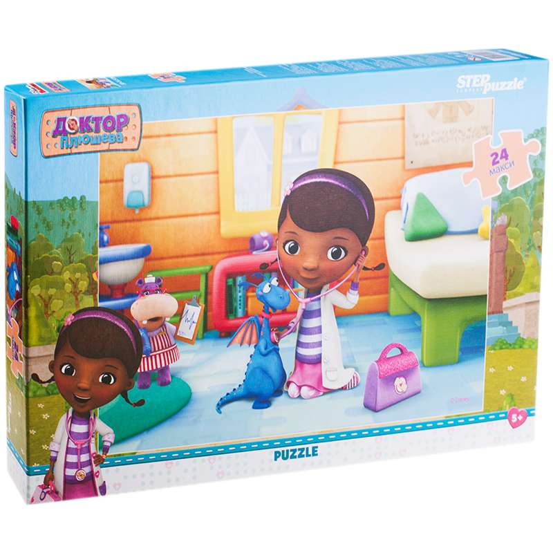 Хорошим врачом может быть даже ребенок. Главное — желание помочь близким. В этом уверена 6-летняя героиня мультсериала Дотти, зовущая себя Доктор Плюшева, которая просто обожает свои игрушки. Стоит ей только поднести к ним стетоскоп, и они оживают! Теперь плюшевых зверей можно спросить о самочувствии, измерить им температуру и выписать рецепты, как настоящим пациентам. Вместе с помощниками — драконом Стаффи, овечкой Лэмми и бегемотиком Хэлли — Дотти каждый день учится соблюдать гигиену, правильно питаться и укреплять здоровье.Пазл 24 эл. maxi "Доктор Плюшева"