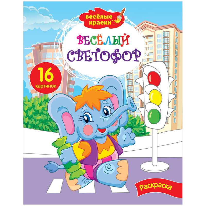 Раскраска для детей младшего возраста. Развивает моторику, память и творческие способности. Блок - офсетная бумага 100 г/м2, 16 страниц, на скобе. Обложка - мелованный картон.Раскраска А4 "Весёлые краски - Весёлый светофор", 16стр.