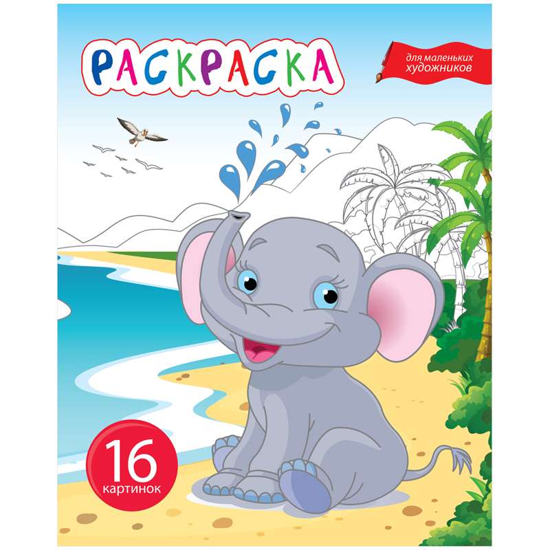 Раскраска для детей младшего возраста. Развивает моторику, память и творческие способности. Блок - офсетная бумага 100 г/м2, 16 страниц, на скобе. Обложка - мелованный картон.Раскраска А5 "Для маленьких художников - Весёлый слон", 16 стр.