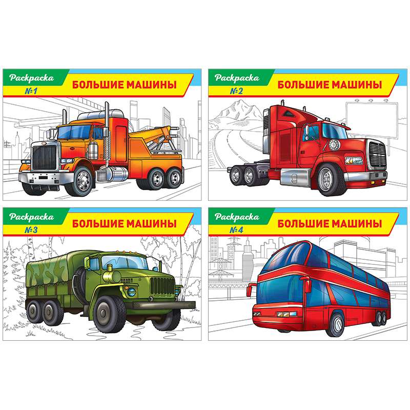 Раскраска для детей младшего и среднего возраста. Развивает моторику, память и творческие способности. Блок - офсетная бумага 100 г/м2, 16 страниц, на скобе. Обложка - плотная мелованная бумага.Раскраска А5 "Техника - Большие машины", 16стр.