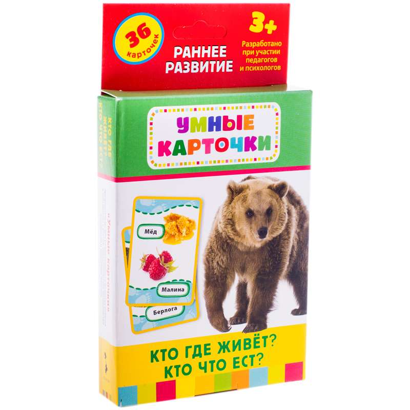 Комплект "Умные карточки" для детей от трех лет - набор из 36 карточек с красочными фотографиями, понятными, интересными заданиями, занимательными играми и методическими рекомендациями.Развивающие карточки "Кто где живет, кто что ест?", 36шт.