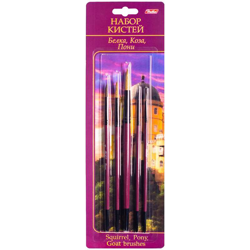 Набор кистей 5шт в блистерной упаковке с европодвесом. Кисти универсальны: ими могут пользоваться как дети, так и профессиональные художники.Набор кистей 5 шт., Белка, круглые № 3, Коза круглые № 6,8, Пони, круглые № 2,5, европодвес