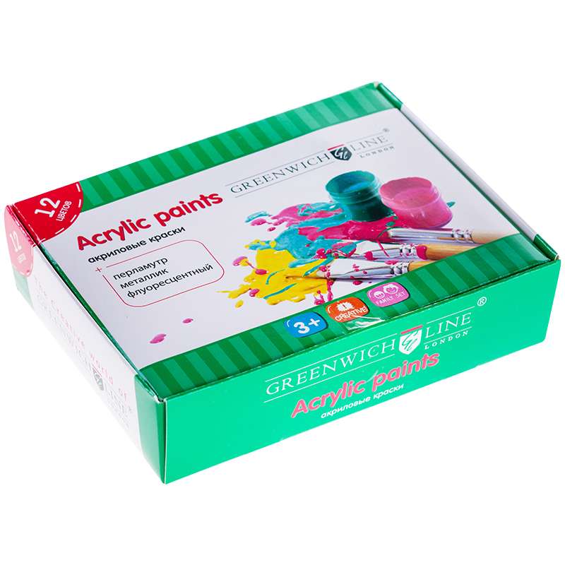 Акриловые краски — универсальный материал для творчества. Акриловые краски, как и акварельные, легко разбавляются водой, но после высыхания их уже нельзя размочить, и в этом "акрилы" сходны с темперой. Акриловые краски применяются в дизайн-графике, рекламе, оформительском искусстве. Цвета: белый, черный, желтый, красный, голубой, зеленый: перламутровые - розовый, зеленый; металлик - серебро светлое, золото; флуоресцентные - оранжевый, сиреневый.Краски акриловые Greenwich Line, 12 цветов, металлик, перламутр, флуор., блестки, 20мл, картон