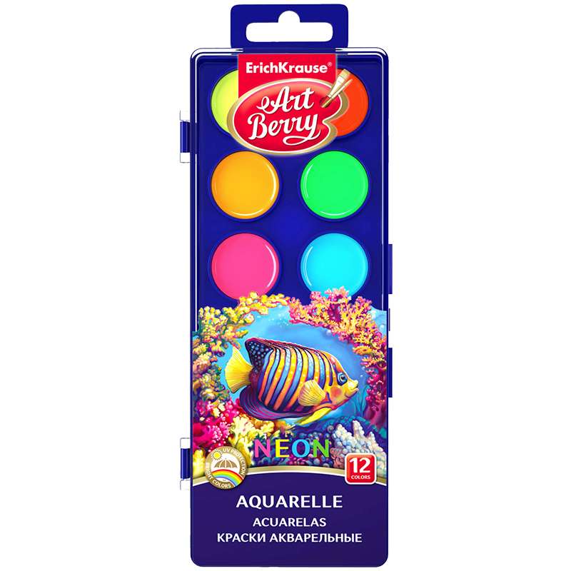Акварельные краски с УФ защитой яркости, с палитрой неоновых цветов в пенале синего цвета, который выделяет их на полкеАкварель ArtBerry "Неон", медовая, 12 цветов, без кисти, неоновая, пластик, европодвес