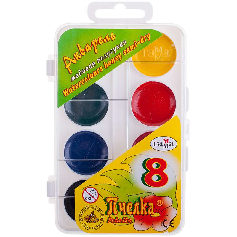 Акварель Гамма "Пчелка", медовая, 08 цветов, без кисти, пластик, европодвес