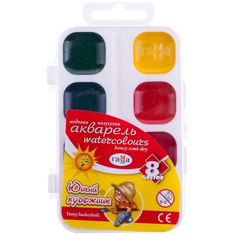 Акварель Гамма "Юный художник", медовая, 08 цветов, без кисти, пластик, европодвес