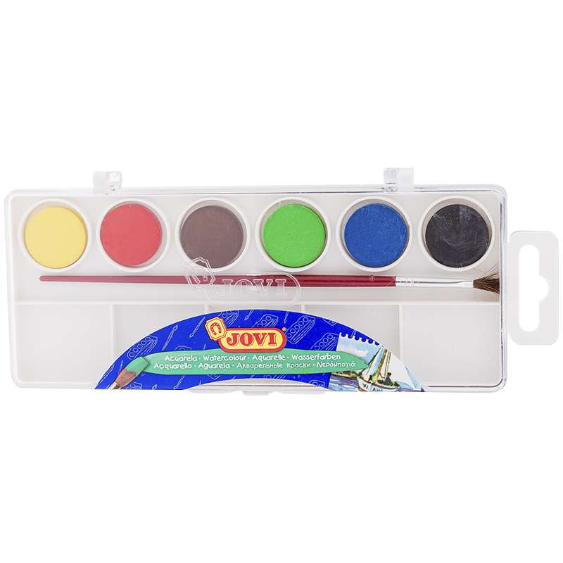 Высококачественная акварель для рисования дома, в школе, в художественных студиях, подходит для разных техник рисования. Шесть базовых цветов (желтый, красный, зеленый, синий, коричневый, черный). Краски в коробке с кюветами для воды и кистью. Спрессованные таблетки диаметром 22 мм (вес 2,9 г) с высоким содержанием пигмента. Гораздо более экономичные, чем полусухая акварель в кюветах. Легко разводятся: при добавлении небольшого количества воды цвета получаются очень насыщенными и яркими, а увеличение количества воды приводит к эффектам, типичным для техники акварели. Хорошо ложатся на поверхность. Могут использоваться для рисования на различных поверхностях: бумаге различной плотности, картоне, для раскрашивания просохших фигурок из пасты для лепки, застывающей на воздухе, или из папье-маше. Краски отстирываются с большинства видов тканей. Страна производства Испания.Акварель JOVI, 06 цветов, малые кюветы, с кистью, с палитрой, пластик, европодвес