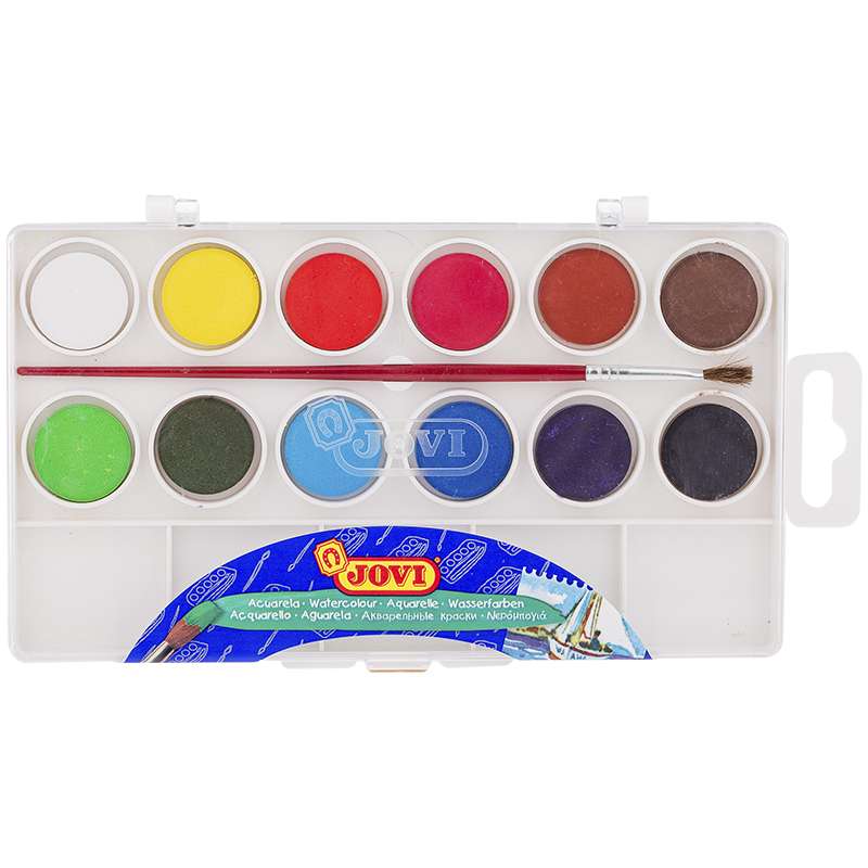Высококачественная акварель для рисования дома, в школе, в художественных студиях, подходит для разных техник рисования. 12 базовых цветов. Краски в коробке с кюветами для воды и кистью. Спрессованные таблетки диаметром 22 мм (вес 2,9 г) с высоким содержанием пигмента. Гораздо более экономичные, чем полусухая акварель в кюветах. Легко разводятся: при добавлении небольшого количества воды цвета получаются очень насыщенными и яркими, а увеличение количества воды приводит к эффектам, типичным для техники акварели. Хорошо ложатся на поверхность. Могут использоваться для рисования на различных поверхностях: бумаге различной плотности, картоне, для раскрашивания просохших фигурок из пасты для лепки, застывающей на воздухе, или из папье-маше. Краски отстирываются с большинства видов тканей. Страна производства Испания.Акварель JOVI, 12 цветов, малые кюветы, с кистью, с палитрой, пластик, европодвес