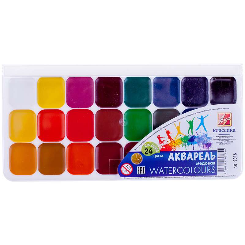 24 цвета Медовые полусухие краски на основе органических пигментов и натурального связующего с добавлением меда куветы с краской квадратныеАкварель Луч "Классика", медовая, 24 цвета, без кисти, пластик
