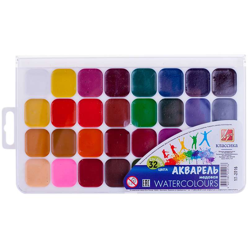 Краски акварельные «Классика» медовые полусухие изготовлены на основе органических пигментов и натурального связующего с добавлением пчелиного мёда, находятся в пластмассовой упаковке с прозрачной крышкой. Акварель предназначена для творчества и различных живописных работ. Акварель "Классика" отличается следующими свойствами: прозрачность красок , яркость и чистота цвета , отличная разносимость и размываемость.Акварель Луч "Классика", медовая, 32 цвета, без кисти, пластик, европодвес