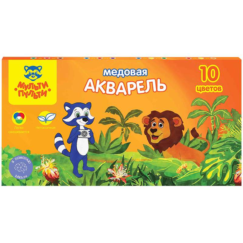 Краски Мульти-Пульти обладают хорошей укрывистостью и остаются яркими при высыхании. Смешивание акварели Мульти-Пульти дает чистые оттенки. Натуральные компоненты делают акварель безопасной для здоровья детей.Акварель Мульти-Пульти "Енот в джунглях", медовая, 10 цветов, без кисти, картон