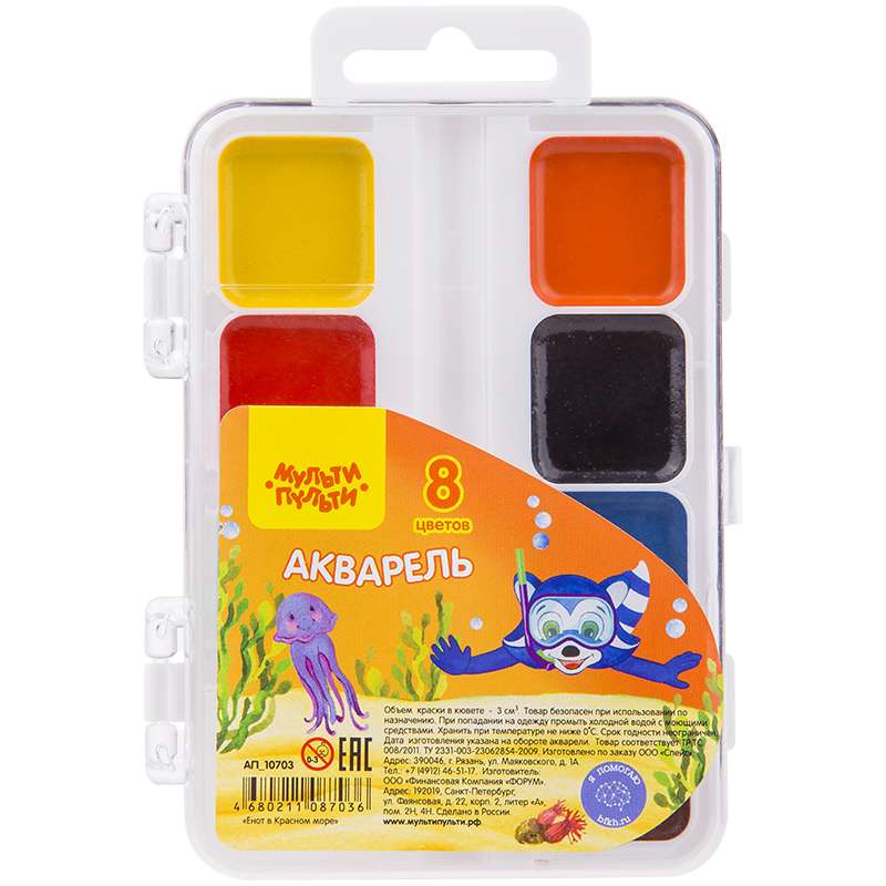 Главная / Товары / КАНЦТОВАРЫ / УПАКОВКА / ХОЗ ТОВАРЫ / РАСХОДНЫЕ МАТЕРИАЛЫ / Канцелярские товары - Школьные / Товары для творчества и хобби / Краски / Краски школьные / Акварель Мульти-Пульти "Енот в Красном море", медовая, 08 цветов, без кисти, пластик, европодвес