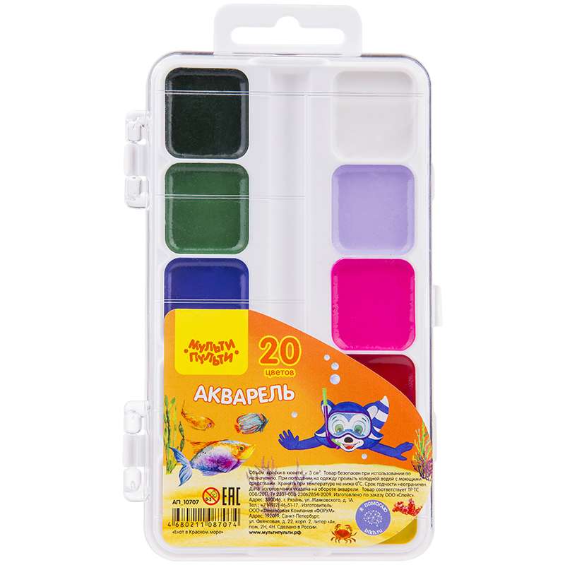 Главная / Товары / КАНЦТОВАРЫ / УПАКОВКА / ХОЗ ТОВАРЫ / РАСХОДНЫЕ МАТЕРИАЛЫ / Канцелярские товары - Школьные / Товары для творчества и хобби / Краски / Краски школьные / Акварель Мульти-Пульти "Енот в Красном море", медовая, 20 цветов, без кисти, пластик, европодвес
