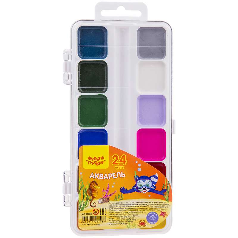 Главная / Товары / КАНЦТОВАРЫ / УПАКОВКА / ХОЗ ТОВАРЫ / РАСХОДНЫЕ МАТЕРИАЛЫ / Канцелярские товары - Школьные / Товары для творчества и хобби / Краски / Краски школьные / Акварель Мульти-Пульти "Енот в Красном море", медовая, 24 цветов, без кисти, пластик, европодвес