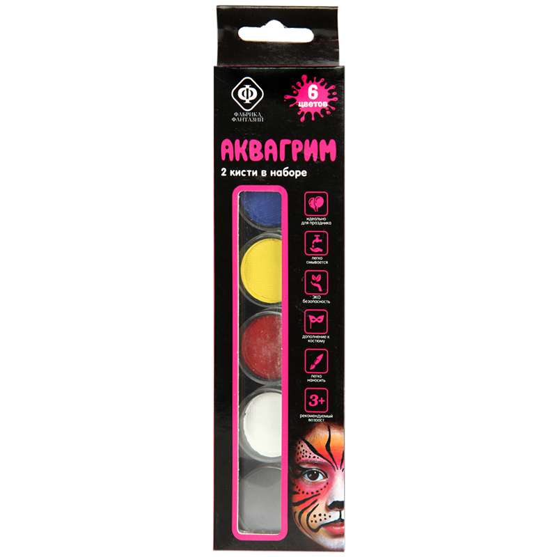 Как просто и легко задать новое настроение, образ, помочь детям и взрослым стать сказочными героями? Нужно всего-то немного грима на лице! Рисунки на лице создадут веселую атмосферу на любом мероприятии. Краски-грим помогут дополнить праздничный костюм, показать характер персонажа. С помощью красок можно создать удивительные образы: стать принцессой, отважным принцем, бабочкой, волшебником, и многими другими сказочными персонажами. Краски-грим абсолютно безвредны для кожи, они легко наносятся и также легко смываются водой и мылом.Краски для грима Фабрика фантазий, 06 цветов, 2 кисти, картон, европодвес