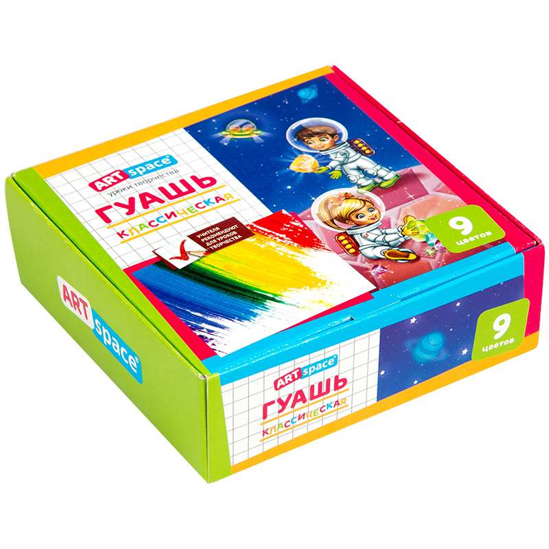 Набор гуашевых красок, 9 цветов, 20 мл. Насыщенные и яркие цвета. Краски хорошо разносятся на бумаге.Гуашь ArtSpace "Космонавты", 09 цветов, 20мл, картон