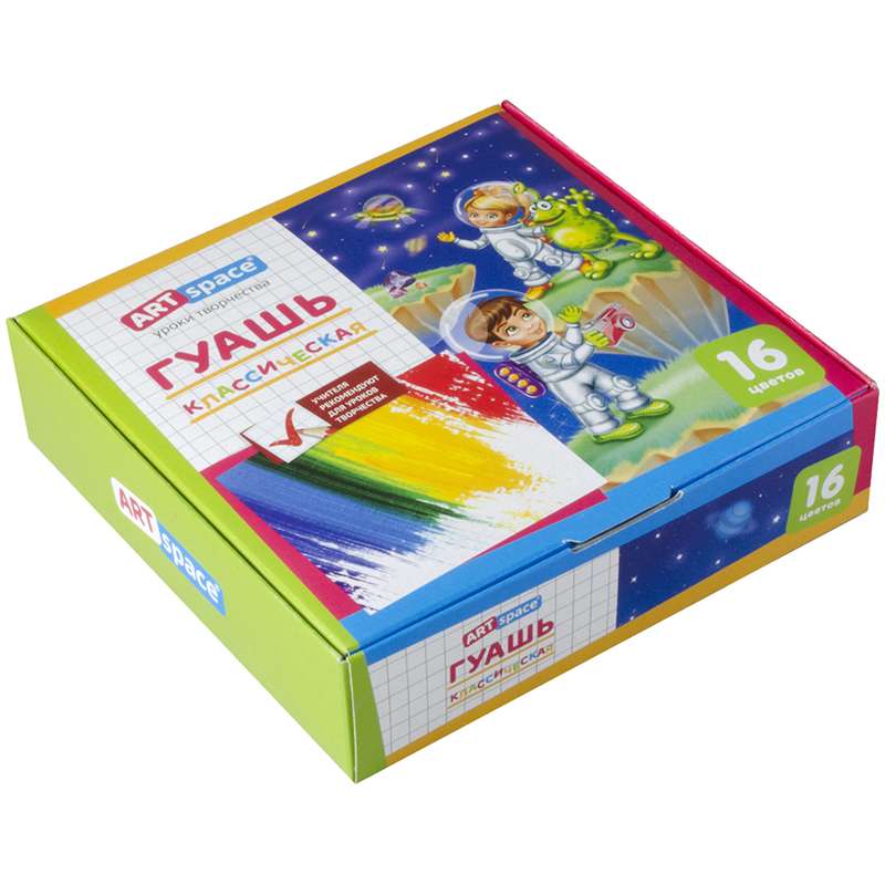 Набор гуашевых красок, 16 цветов, 20 мл. Насыщенные и яркие цвета. Краски хорошо разносятся на бумаге.Гуашь ArtSpace "Космонавты", 16 цветов, 20мл, картон