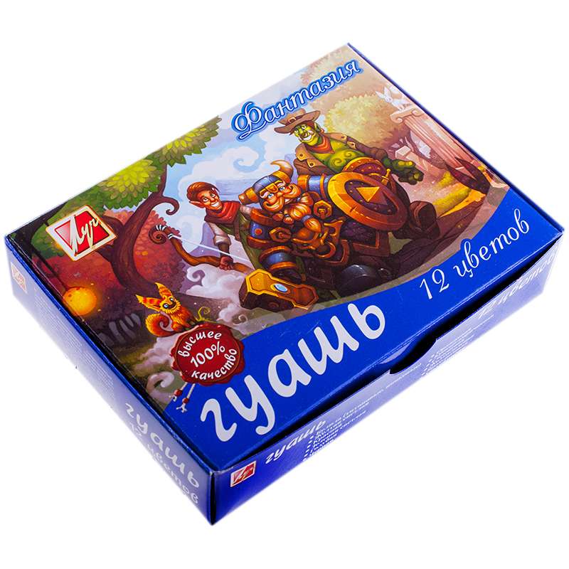 Наборы гуаши ФАНТАЗИЯ имеют прекрасную палитру ярких, чистых звучных цветов. Гуашь разлита в пластмассовые баночки объёмом 15 мл с завинчивающейся крышкой, содержащей наклейку с указанием цвета краски. Краски упакованы в цветную картонную коробку.Гуашь Луч "Фантазия", 12 цветов, 15мл, картон