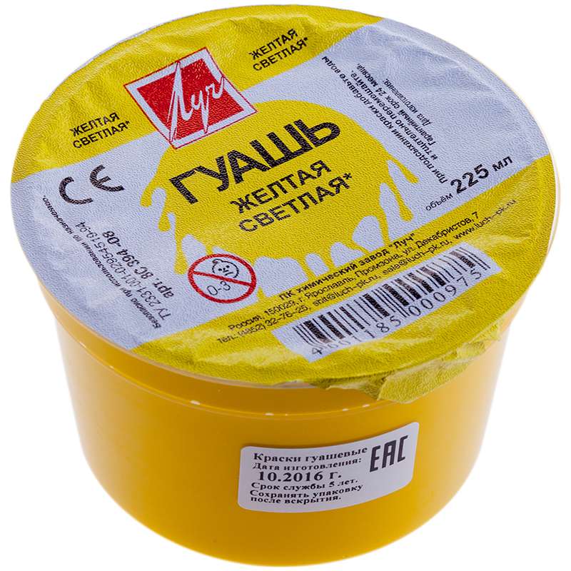 Гуашевые краски отдельными наименованиями в баночках 225 мл. Предназначена для творчества, художественно-декоративных, оформительских работ. Краски изготовлены на основе натуральных компонентов и высококачественных пигментов.Гуашь Луч, желтая светлая, 225мл.