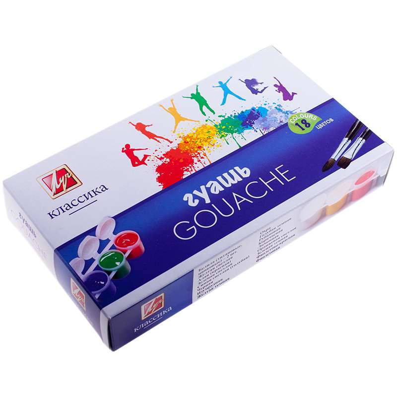Гуашь «Классика» предназначена для детского творчества, выполнения художественно-декоративных, оформительских работ. Краски изготовлены на основе натуральных компонентов и высококачественных пигментов. Краска находится в пластмассовых, герметичных блок - таре.Гуашь Луч "Классика", 18 цветов, 20мл, картон