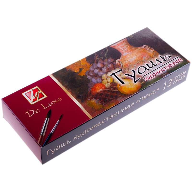 Краски гуашевые художественные "Люкс" изготовлены на основе растительного клея-гуммиарабика и пигментов высокого класса. Гуашь разлита в пластмассовые баночки объёмом 20 мл с завинчивающейся крышкой, содержащей яркую наклейку с обозначением цвета краски. Краски упакованы в цветную картонную коробку.Гуашь Луч "Люкс", 12 цветов, 20мл, картон