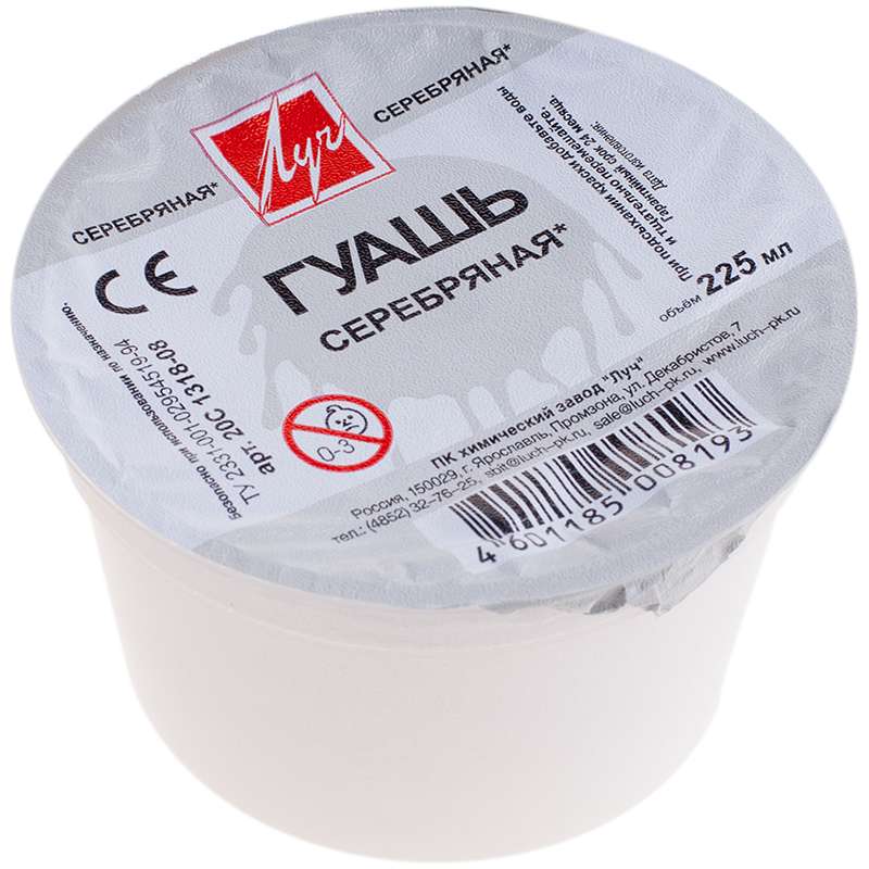 Гуашевые краски отдельными наименованиями в баночках 225 мл. Предназначена для творчества, художественно-декоративных, оформительских работ. Краски изготовлены на основе натуральных компонентов и высококачественных пигментов.Гуашь Луч, серебряная, 225мл.