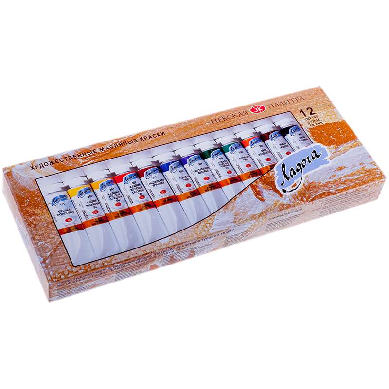Состав набора: белила цинковые или белила титановые; кадмий лимонный (А); кадмий желтый светлый (А) или кадмий желтый средний (А); кадмий красный светлый (А) или кадмий красный темный (А); охра красная или английская красная или индийская красная; кобальт синий средний (А) или голубая «ФЦ» или кобальт синий светлый (А); ультрамарин светлый; кобальт зеленый темный (А) или кобальт зеленый светлый (А); виридоновая зеленая или зеленая «ФЦ»; сиена натуральная или охра светлая или охра золотистая; умбра натуральная ленинградская или Сиена жженая; сажа газовая или шунгитКраски масляные Ладога, 12 цветов, 18мл/туба, картон