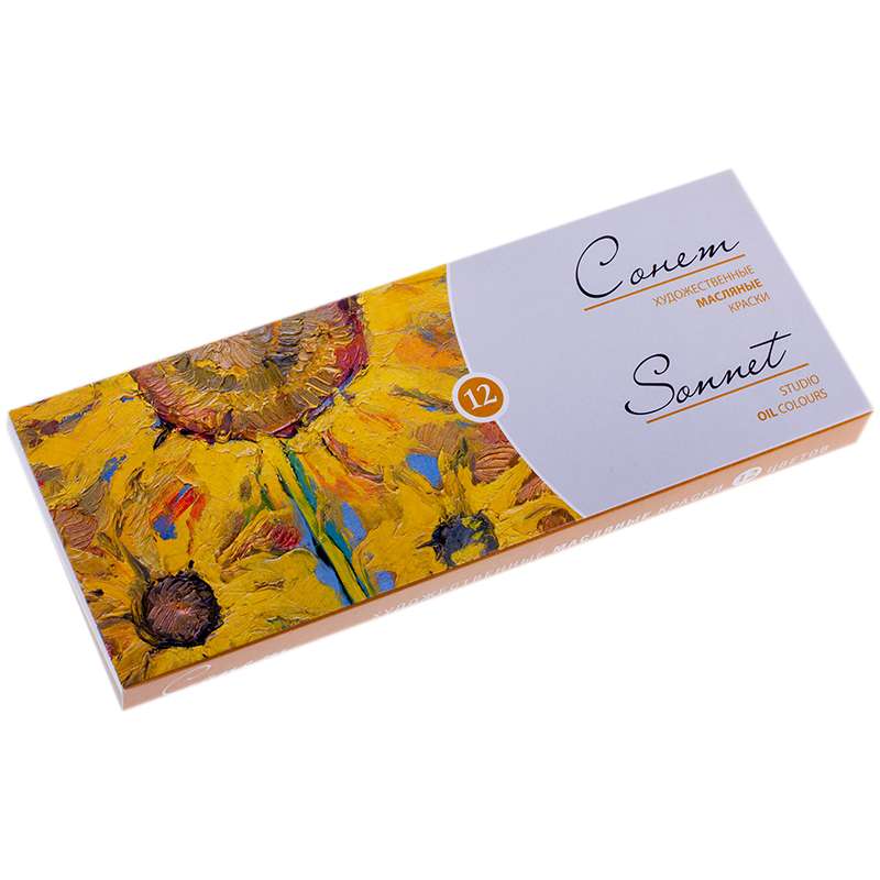 Набор художественных масляных красок, 12 цветов. Состав набора: белила цинковые; белила титановые; лимонная; желтая светлая или желтая средняя; красная светла или красная темная; карминовая; ультрамарин светлый; синяя светлая или синяя средняя; зеленая "ФЦ" или травяная; охра желтая или охра золотистая; умбра жженая; сажа газовая.Краски масляные Сонет, 12 цветов, 10мл/туба, картон