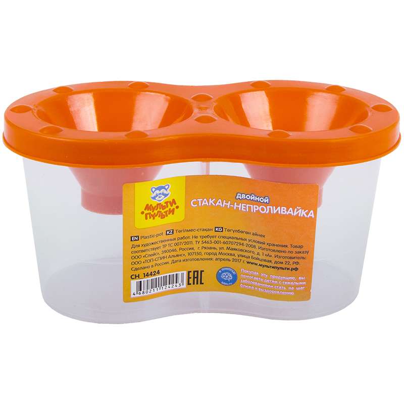 Идеален для использования при рисовании красками. Объем стакана оптимально подобран для обхвата детской рукой. Специальная форма стакана с плотно закрывающейся крышкой исключает возможность вытекания воды. Материал - полупрозрачный пластик, крышка оранжевого цвета.Стакан-непроливайка двойной Мульти-Пульти, оранжевый