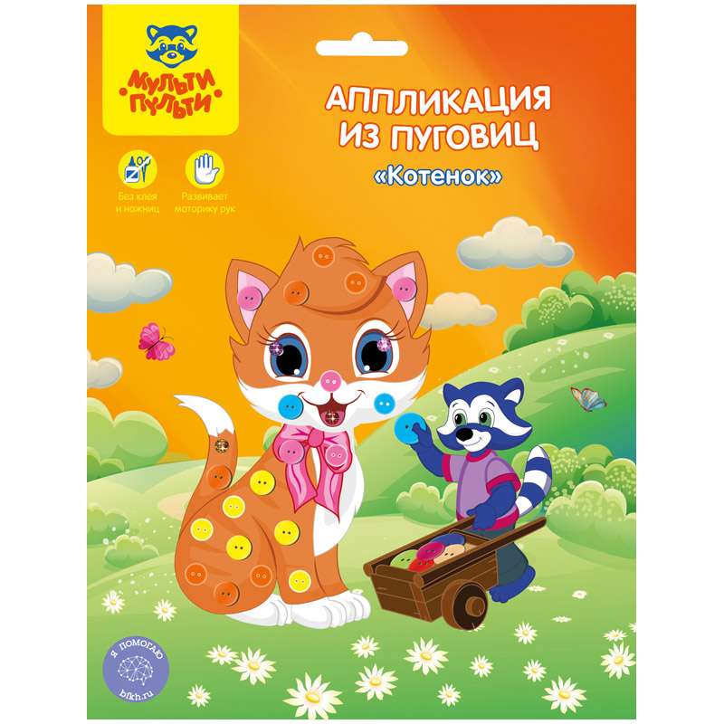 Аппликация из пуговиц - прекрасное средство развития воображения, аккуратности и терпения у ребенка, а также мелкой моторики, внимания и мышления. С помощью аппликации Мульти-Пульти ваш ребенок сможет создать доступную и интересную поделку с разноцветными пуговицами и провести время с пользой.Аппликация из пуговиц 19*22 Мульти-Пульти "Котенок"