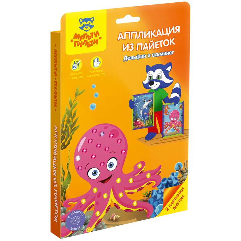 Аппликация из пайеток - очень увлекательное занятие для малышей. В данном наборе есть все необходимые элементы для аппликации, а в процессе работы ребенку не потребуются ни ножницы, ни клей. Способствует развитию мелкой моторики рук, внимания, воображения и усидчивости.Аппликация-картина из пайеток Мульти-Пульти "Дельфин и осьминог"