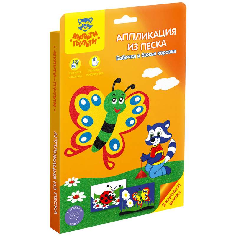 Процесс создания аппликации или картины из песка - прост и увлекателен. В данном наборе есть все необходимые элементы для аппликации, в процессе работы ребенку не понадобится ни клей, ни ножницы.Аппликация из песка Мульти-Пульти "Бабочка и божья коровка", картонная коробка, европодвес