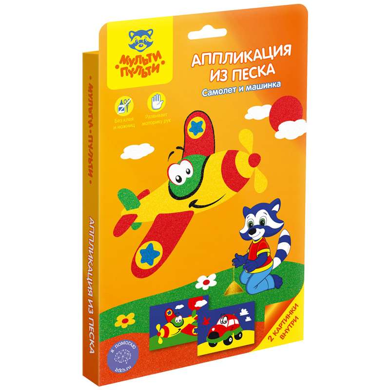 Процесс создания аппликации или картины из песка - прост и увлекателен. В данном наборе есть все необходимые элементы для аппликации, в процессе работы ребенку не понадобится ни клей, ни ножницы.Аппликация из песка Мульти-Пульти "Самолет и машинка", картонная коробка, европодвес