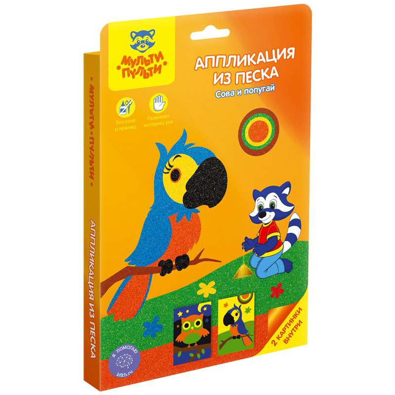 Процесс создания аппликации или картины из песка - прост и увлекателен. В данном наборе есть все необходимые элементы для аппликации, в процессе работы ребенку не понадобится ни клей, ни ножницы.Аппликация из песка Мульти-Пульти "Сова и попугай", картонная коробка, европодвес