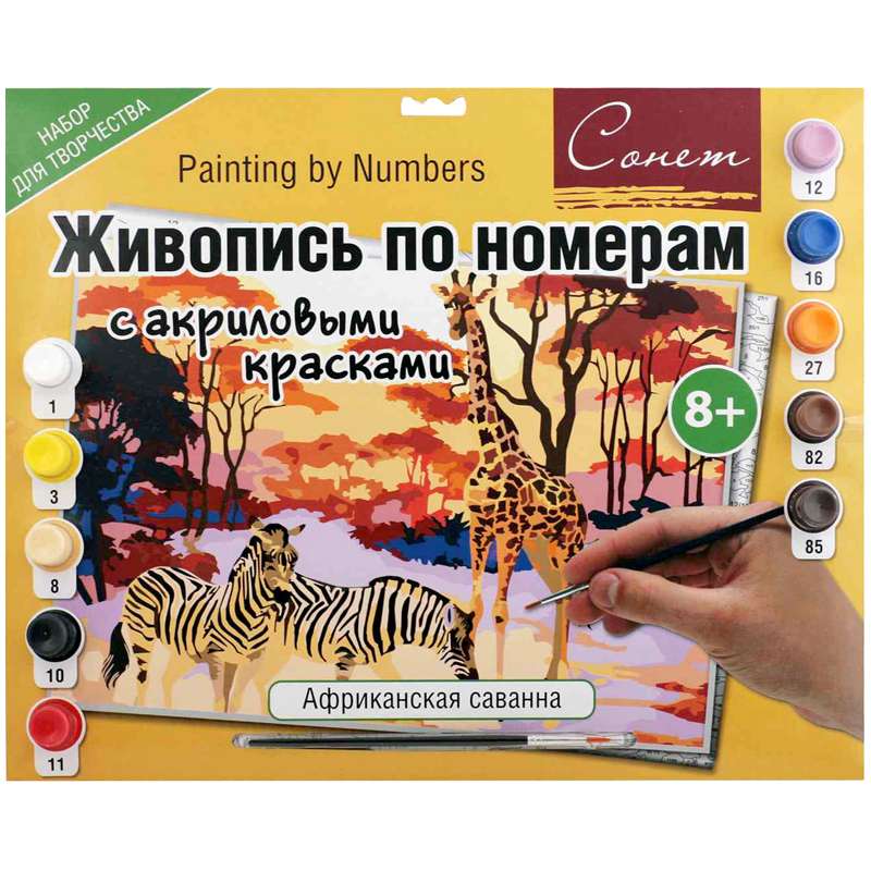 Главная / Товары / КАНЦТОВАРЫ / УПАКОВКА / ХОЗ ТОВАРЫ / РАСХОДНЫЕ МАТЕРИАЛЫ / Канцелярские товары - Школьные / Товары для творчества и хобби / Наборы для детского творчества / Наборы для рисования / Картина по номерам Сонет "Африканская саванна" A3, с акриловыми красками, картон, европодвес