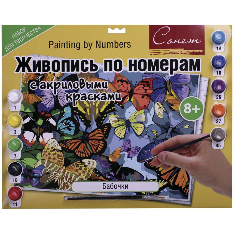 Главная / Товары / КАНЦТОВАРЫ / УПАКОВКА / ХОЗ ТОВАРЫ / РАСХОДНЫЕ МАТЕРИАЛЫ / Канцелярские товары - Школьные / Товары для творчества и хобби / Наборы для детского творчества / Наборы для рисования / Картина по номерам Сонет "Бабочки" A3, с акриловыми красками, картон, европодвес