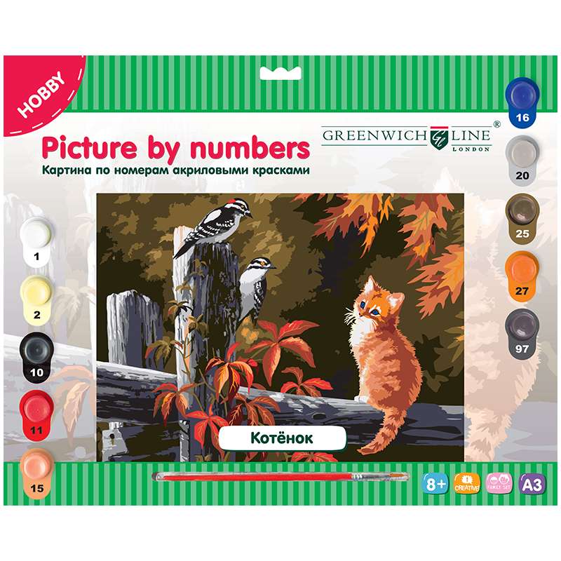 Главная / Товары / КАНЦТОВАРЫ / УПАКОВКА / ХОЗ ТОВАРЫ / РАСХОДНЫЕ МАТЕРИАЛЫ / Канцелярские товары - Школьные / Товары для творчества и хобби / Наборы для детского творчества / Наборы для рисования / Картина по номерам Greenwich Line "Котёнок" A3, с акриловыми красками, картон, европодвес