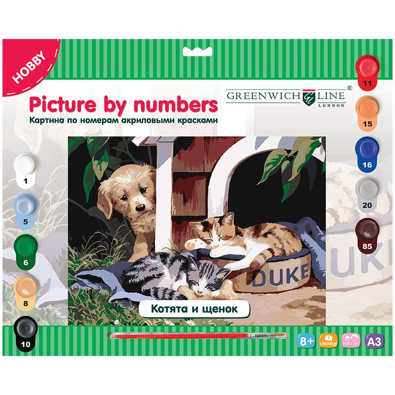 Главная / Товары / КАНЦТОВАРЫ / УПАКОВКА / ХОЗ ТОВАРЫ / РАСХОДНЫЕ МАТЕРИАЛЫ / Канцелярские товары - Школьные / Товары для творчества и хобби / Наборы для детского творчества / Наборы для рисования / Картина по номерам Greenwich Line "Котята и щенок" A3, с акриловыми красками, картон, европодвес