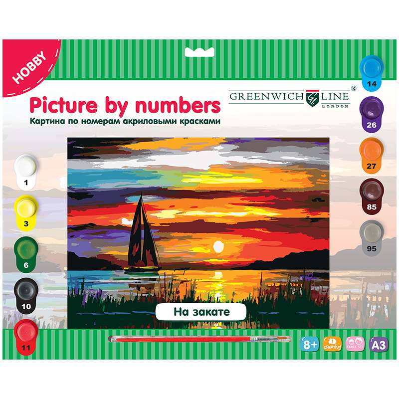Главная / Товары / КАНЦТОВАРЫ / УПАКОВКА / ХОЗ ТОВАРЫ / РАСХОДНЫЕ МАТЕРИАЛЫ / Канцелярские товары - Школьные / Товары для творчества и хобби / Наборы для детского творчества / Наборы для рисования / Картина по номерам Greenwich Line "На закате" A3, с акриловыми красками, картон, европодвес