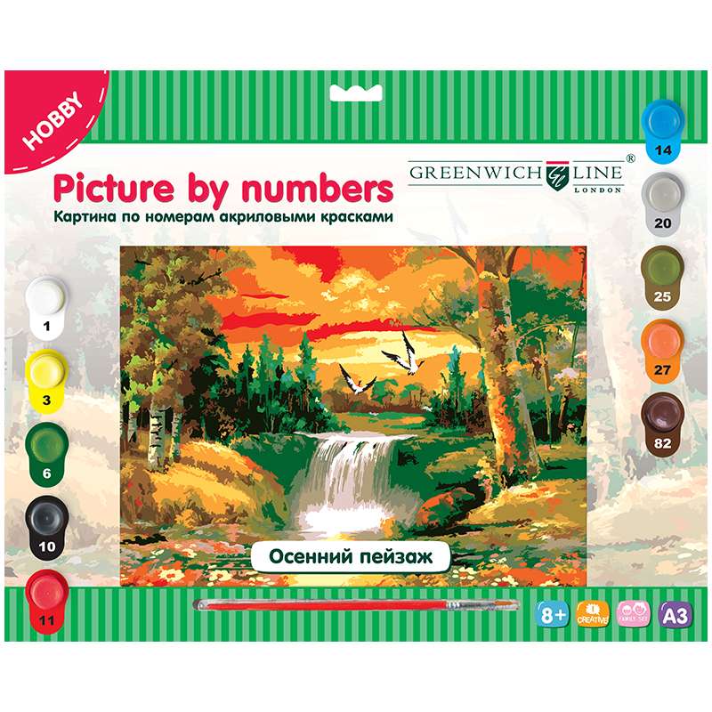 Главная / Товары / КАНЦТОВАРЫ / УПАКОВКА / ХОЗ ТОВАРЫ / РАСХОДНЫЕ МАТЕРИАЛЫ / Канцелярские товары - Школьные / Товары для творчества и хобби / Наборы для детского творчества / Наборы для рисования / Картина по номерам Greenwich Line "Осений пейзаж" A3, с акриловыми красками, картон, европодвес