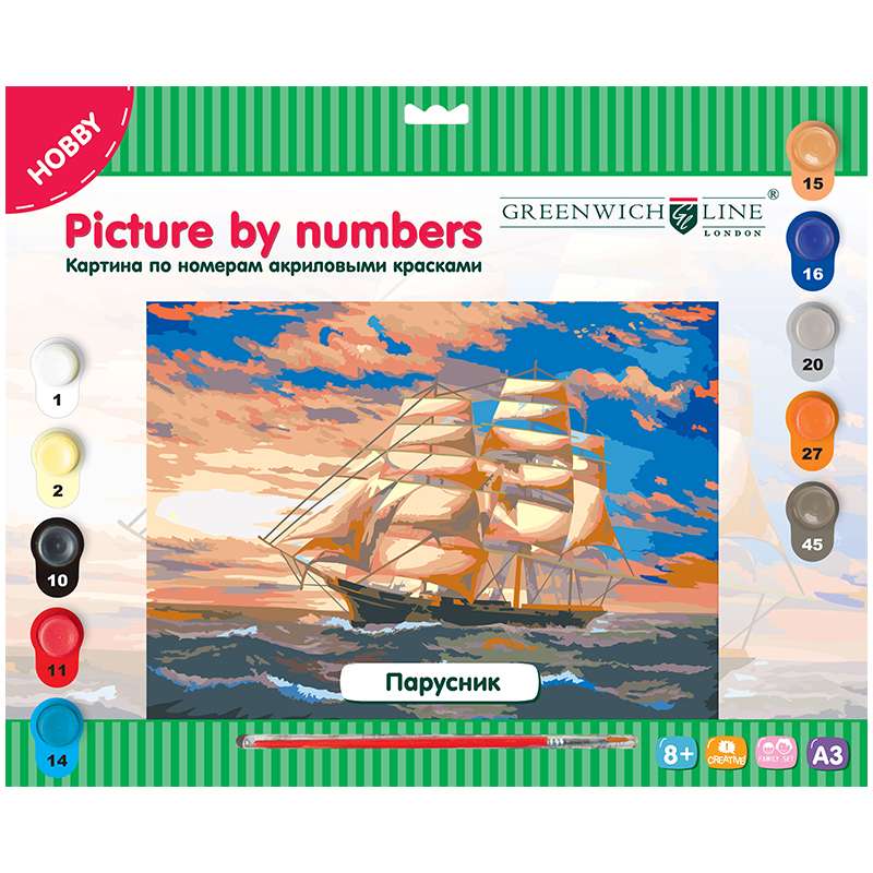 Главная / Товары / КАНЦТОВАРЫ / УПАКОВКА / ХОЗ ТОВАРЫ / РАСХОДНЫЕ МАТЕРИАЛЫ / Канцелярские товары - Школьные / Товары для творчества и хобби / Наборы для детского творчества / Наборы для рисования / Картина по номерам Greenwich Line "Парусник" A3, с акриловыми красками, картон, европодвес
