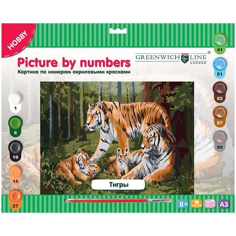 Главная / Товары / КАНЦТОВАРЫ / УПАКОВКА / ХОЗ ТОВАРЫ / РАСХОДНЫЕ МАТЕРИАЛЫ / Канцелярские товары - Школьные / Товары для творчества и хобби / Наборы для детского творчества / Наборы для рисования / Картина по номерам Greenwich Line "Тигры" A3, с акриловыми красками, картон, европодвес