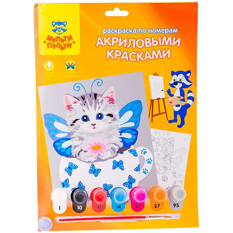 Главная / Товары / КАНЦТОВАРЫ / УПАКОВКА / ХОЗ ТОВАРЫ / РАСХОДНЫЕ МАТЕРИАЛЫ / Канцелярские товары - Школьные / Товары для творчества и хобби / Наборы для детского творчества / Наборы для рисования / Раскраска по номерам Мульти-Пульти "Котенок в голубом" А4, с акриловыми красками, картон, европодвес