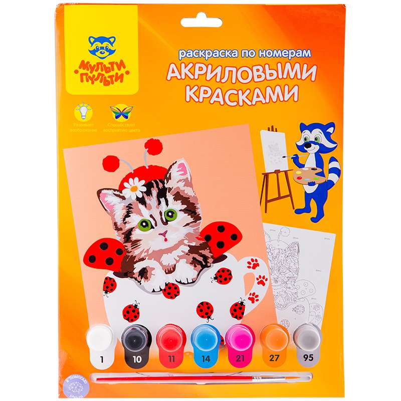 Главная / Товары / КАНЦТОВАРЫ / УПАКОВКА / ХОЗ ТОВАРЫ / РАСХОДНЫЕ МАТЕРИАЛЫ / Канцелярские товары - Школьные / Товары для творчества и хобби / Наборы для детского творчества / Наборы для рисования / Раскраска по номерам Мульти-Пульти "Котенок в красном" А4, с акриловыми красками, картон, европодвес