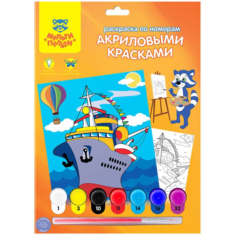 В набор входят: 1 картон с нанесенным контуром, пронумерованный в соответствии с номерами красок; 7 акриловых красок; 1 кисть; 1 лист бумаги для тренировки.Раскраска по номерам А4 "Пароход" с акриловыми красками