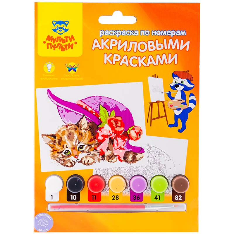 Главная / Товары / КАНЦТОВАРЫ / УПАКОВКА / ХОЗ ТОВАРЫ / РАСХОДНЫЕ МАТЕРИАЛЫ / Канцелярские товары - Школьные / Товары для творчества и хобби / Наборы для детского творчества / Наборы для рисования / Раскраска по номерам Мульти-Пульти "Котенок и шляпа" А5, с акриловыми красками, картон, европодвес