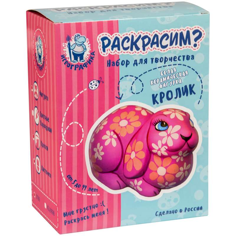 Белая керамическая фигурка для росписи красками или цветными карандашами. Краска легко смывается под водой, что позволяет перекрасить фигуру. Интересный набор, который позволит ребенку проявить свои творческие способности.Набор для росписи изделий из керамики Игрографика с акриловыми красками "Кролик"